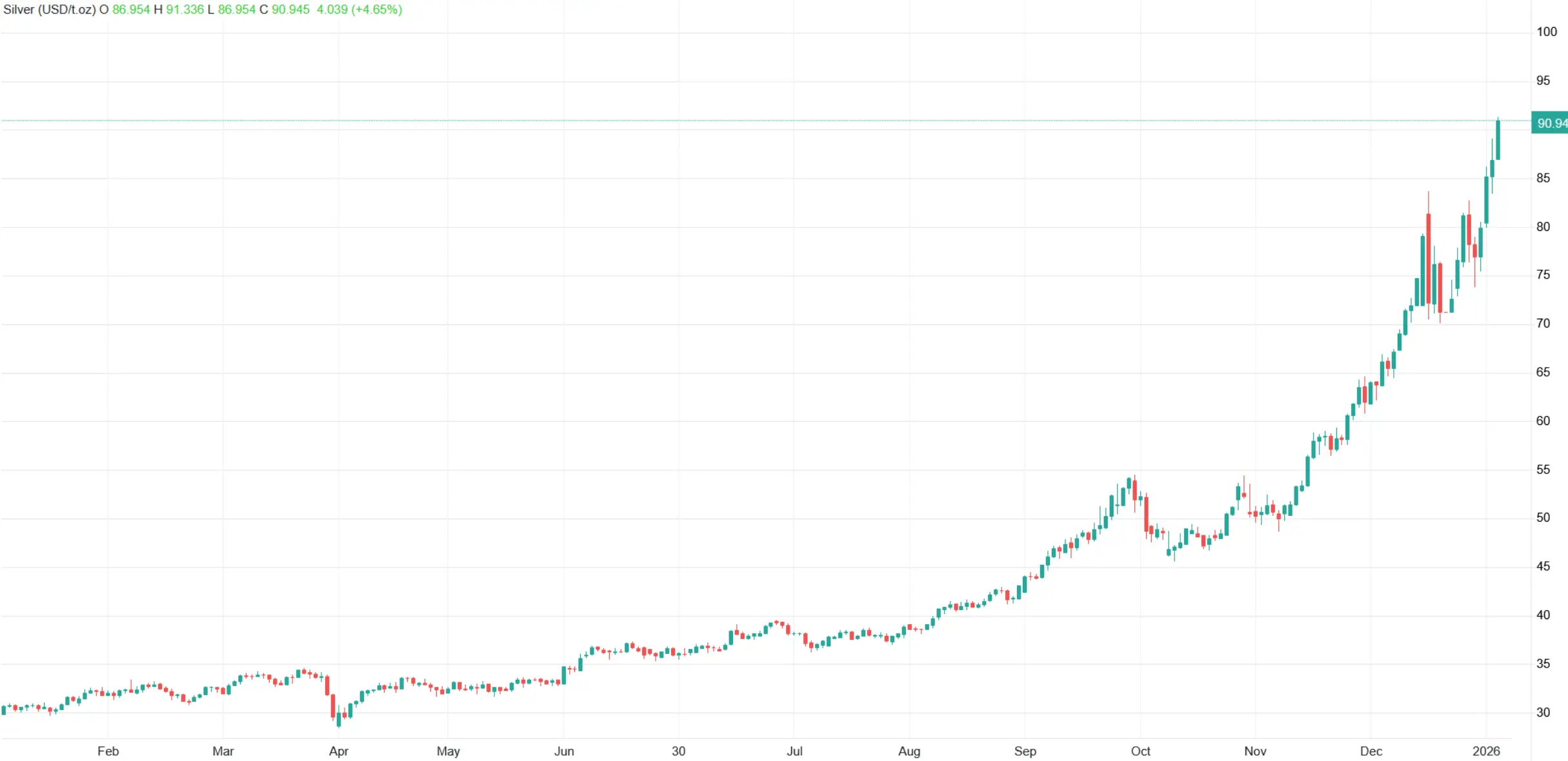 نقره نیز در حالی سقف جدید ۹۱ دلار و ۳۳ سنتی در هر اونس را لمس و روند صعودی خود را به بالاترین سطوح جدید قیمتی ادامه داد که در حال حاضر با رشد چشمگیر ۴.۶۵ درصدی (۴ دلاری) در قیمت ۹۰ دلار و ۹۴ سنتی داد و ستد میشود.