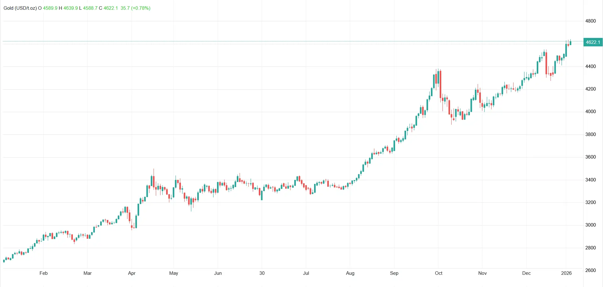 به گزارش شرق به نقل از مهر، بهای جهانی طلا در روز چهارشنبه ۲۴ دی ماه ۱۴۰۴ برابر با ۱۴ ژانویه ۲۰۲۶ اگرچه به مرز ۴,۶۴۰ دلار در هر اونس نزدیک شد و روند ثبت رکورد خود را ادامه داد، اکنون در حدود ۴۶۲۲ دلار در حال داد و ستد است و رشد قیمتی ۰.۷۸ درصدی را نسبت به معاملات روز گذشته نشان میدهد.