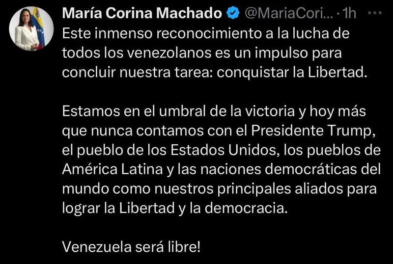 ما در آستانه پیروزی ایستادهایم، و امروز بیش از هر زمان دیگر، بر حمایت رئیسجمهور ترامپ، مردم ایالات متحده، ملتهای آمریکای لاتین و کشورهای دموکراتیک جهان بهعنوان اصلیترین متحدان خود برای رسیدن به آزادی و دموکراسی تکیه داریم./آسیانیوز