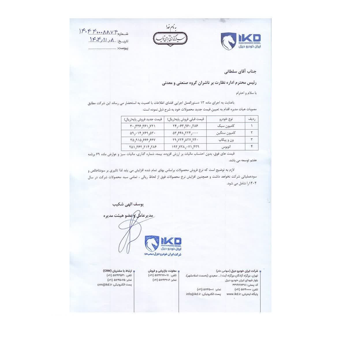 روزنامه آسیا-شرکت ایرانخودرو دیزل قیمت چهار محصول سنگین و نیمهسنگین خود را با افزایشی بین ۶۰۰ میلیون تا ۶ میلیارد تومان بالا برد؛ افزایشی که به گفته مدیرعامل این شرکت، تأثیری در سودآوری ندارد.
