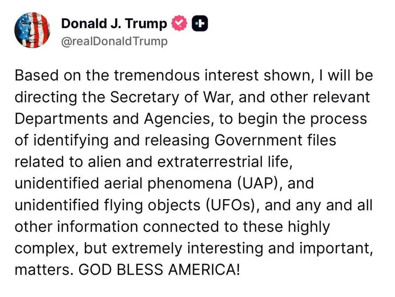روزنامه آسیا-رئیسجمهور آمریکا اعلام کرد به نهادهای دولتی از جمله وزارت جنگ دستور داده است روند شناسایی و انتشار اسناد مربوط به موجودات فضایی، حیات فرازمینی و پدیدههای هوایی ناشناس آغاز شود.