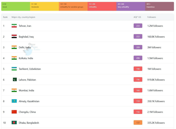 روزنامه آسیا-تهران با شاخص ۲۳۳ در صدر آلودهترین شهرهای جهان قرار گرفت.