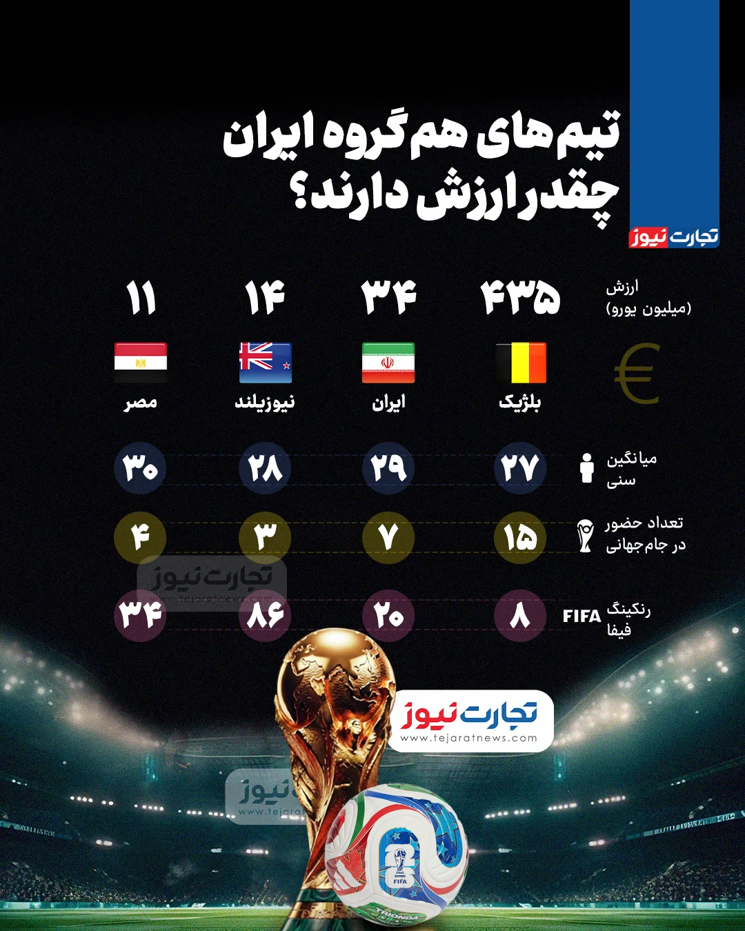 روزنامه آسیا-بررسی تازه از ارزش تیمهای گروه G جام جهانی ۲۰۲۶ نشان میدهد بلژیک با اختلافی چشمگیر صدرنشین این گروه است و ارزش بازیکنانش بیش از ۱۲ برابر تیم ملی ایران برآورد شده است. ایران نیز بالاتر از مصر و نیوزیلند قرار دارد.