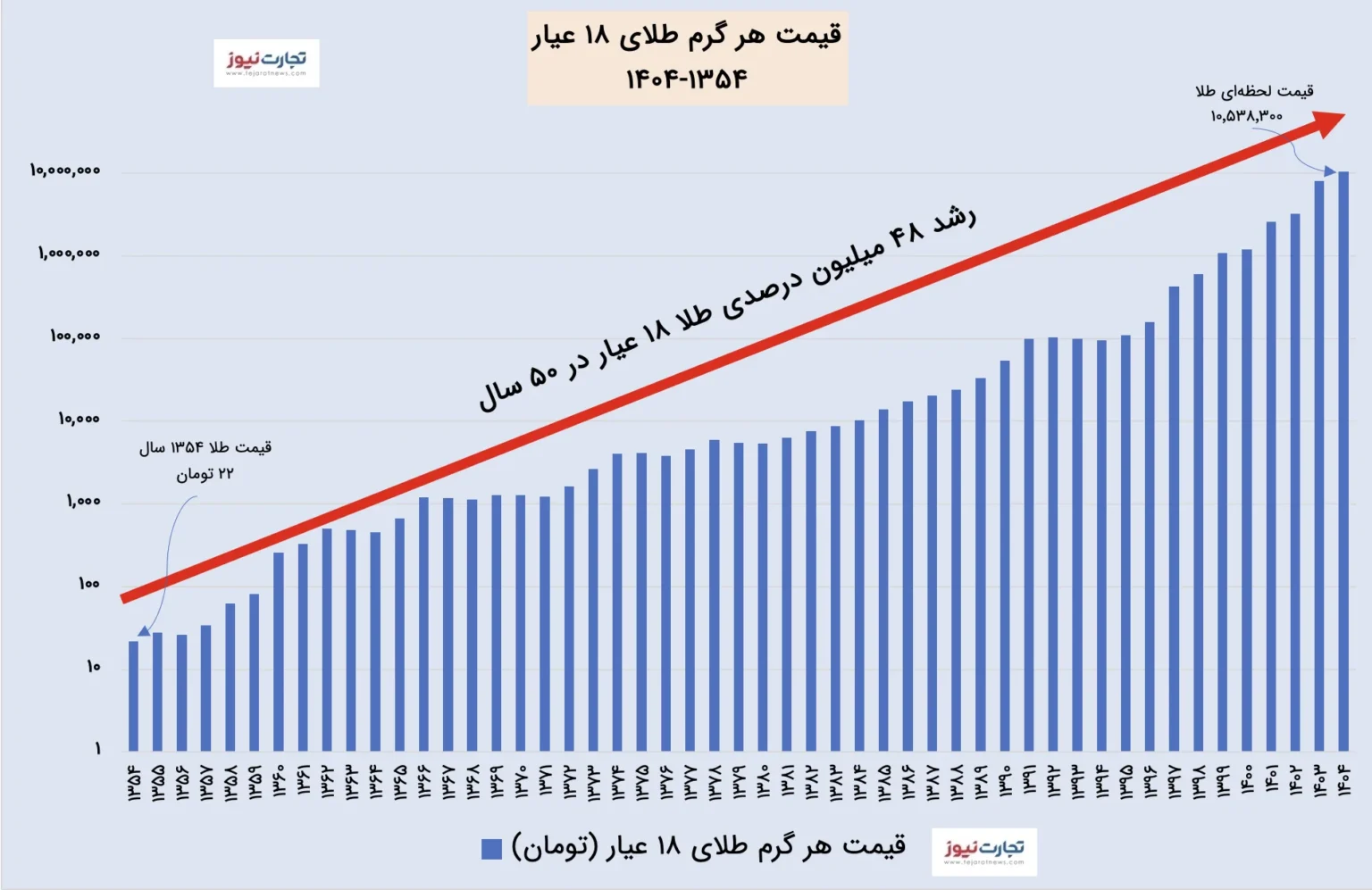 به گزارش تجارت نیوز، در طول نیم قرن گذشته، قیمت طلا در ایران مسیر شگفتانگیزی را طی کرده است؛ از ۲۲ تومان در سال ۱۳۵۴ تا بیش از ۱۰ میلیون تومان در سال ۱۴۰۴. این رشد ۴۸ میلیون درصدی، فقط یک تغییر قیمتی نیست؛ بلکه روایتگر ۵۰ سال تورم، نوسان ارزی، تحریم و بیاعتمادی به پول ملی است.