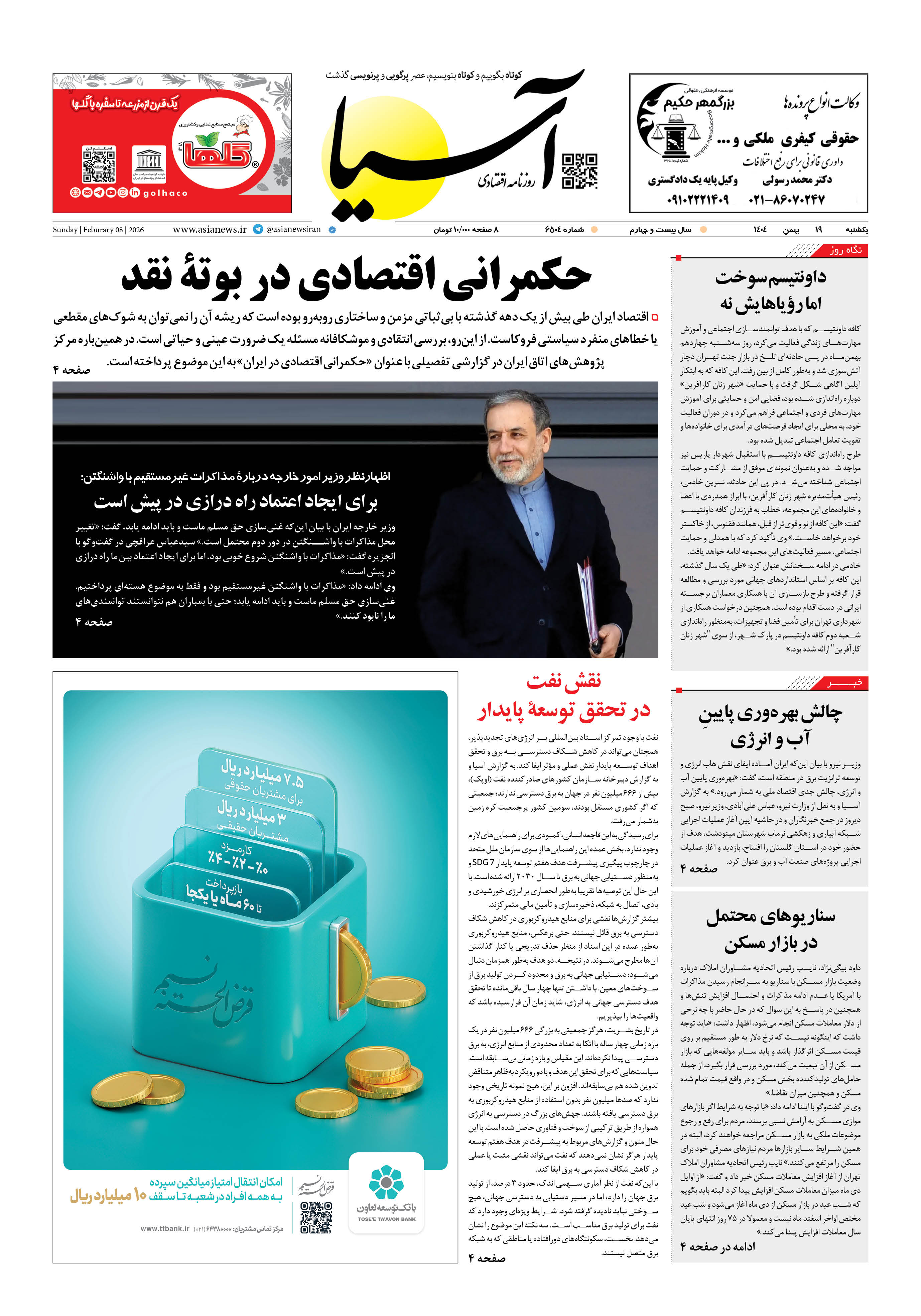 روزنامه اقتصادی آسیا - ۱۹ بهمن ۱۴۰۴