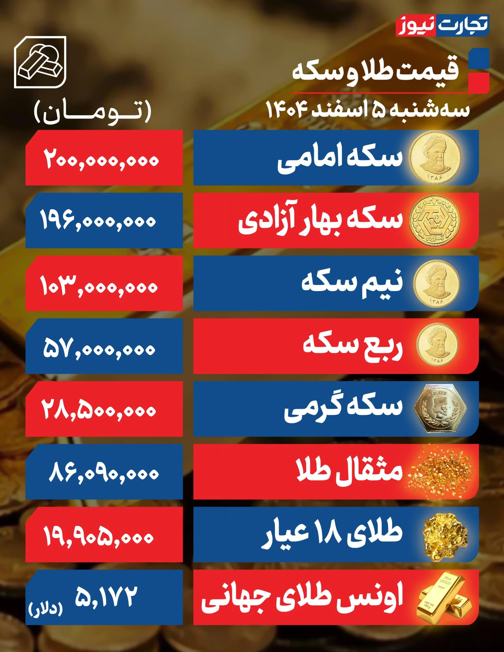 روزنامه آسیا-قیمت طلا و سکه امروز سهشنبه ۵ اسفند ۱۴۰۴ با افزایش همراه شد و سکه امامی در کانال ۲۰۰ میلیون تومان معامله شد.