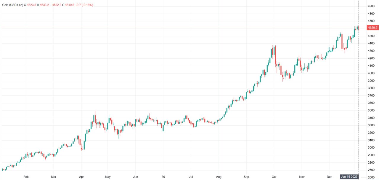 به گزارش خبرگزاری خبرآنلاین، قیمت جهانی طلا در روز پنجشنبه ۲۵ دی ۱۴۰۴ برابر با ۱۵ ژانویه ۲۰۲۶ در حالی با کاهش ۰.۱۸ درصدی، ۹ دلار و ۷۰ سنت افت قیمت در هر اونس را تجربه کرده است و در محدوده ۴۶۲۰ دلار داد و ستد میشود که سقف و کف روزانه ۴۶۳۳ دلار و ۲۰ سنت و ۴۵۸۲ دلار و ۳۰ سنت را لمس کرده است و روز گذشته تا سقف تاریخی ۴۶۴۳ دلار و ۱۰ سنت نیز بالا رفته بود.