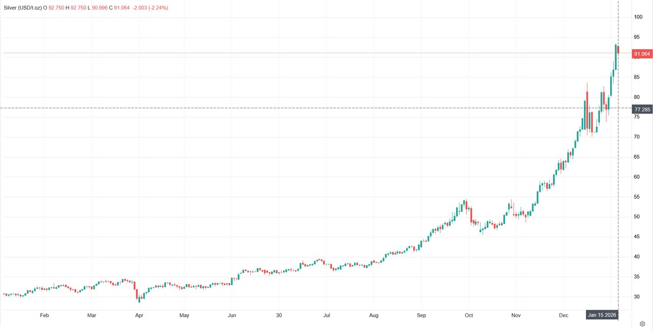 از سوی دیگر بهای نقره نیز که روز گذشته تا سقف ۹۳.۴۷ دلاری بالا رفته بود با افت بیش از ۲ درصدی اکنون در سطح قیمتی ۹۱ دلاری، از سقف تاریخی خود بیش از ۲ دلار فاصله گرفته است. نمودار زیر تغییرات قیمتی بهای جهانی نقره را به صورت روزانه و بر حسب دلار به ازای هر اونس نشان میدهد.