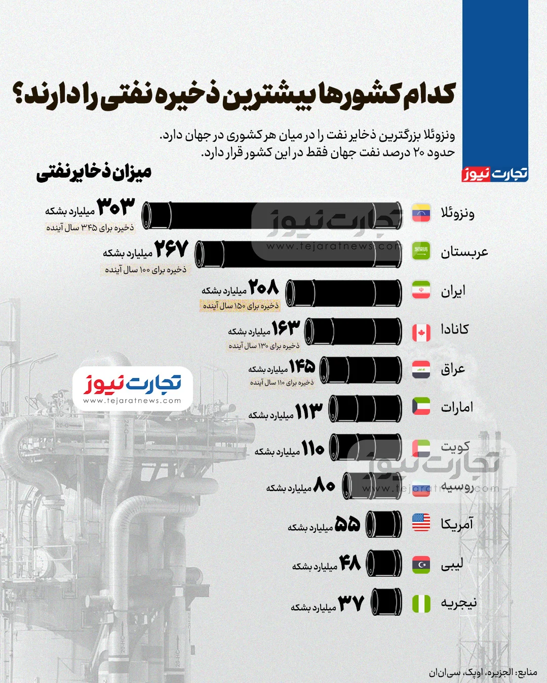 روزنامه آسیا-به گزارش تجارت نیوز، بررسی جدید ذخایر نفتی جهان نشان میدهد ونزوئلا با در اختیار داشتن حدود ۲۰ درصد از کل ذخایر نفت جهان، در رتبه نخست قرار دارد؛ در این میان، ایران نیز با ذخایر خود توان تأمین نفت برای حدود ۱۵۰ سال آینده را دارد.
